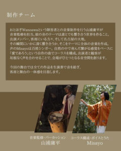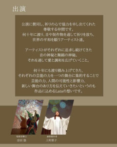 コアの制作メンバーに加え、祈りの舞台をさらに深めるアーティストの方々も祈りの舞台への共感を動機に、ギャラ度外視で一緒に舞台を創りたいと出演を決めてくださっています。