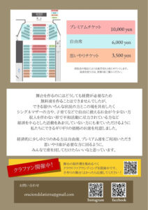 300席収容の舞台を作るには、2日間の劇場確保、舞台監督、照明、音響、機材、美術、広報などに係る費用、ダンサーへの振付指導におけるスタジオ代など約200万円ほどの資金が必要です。